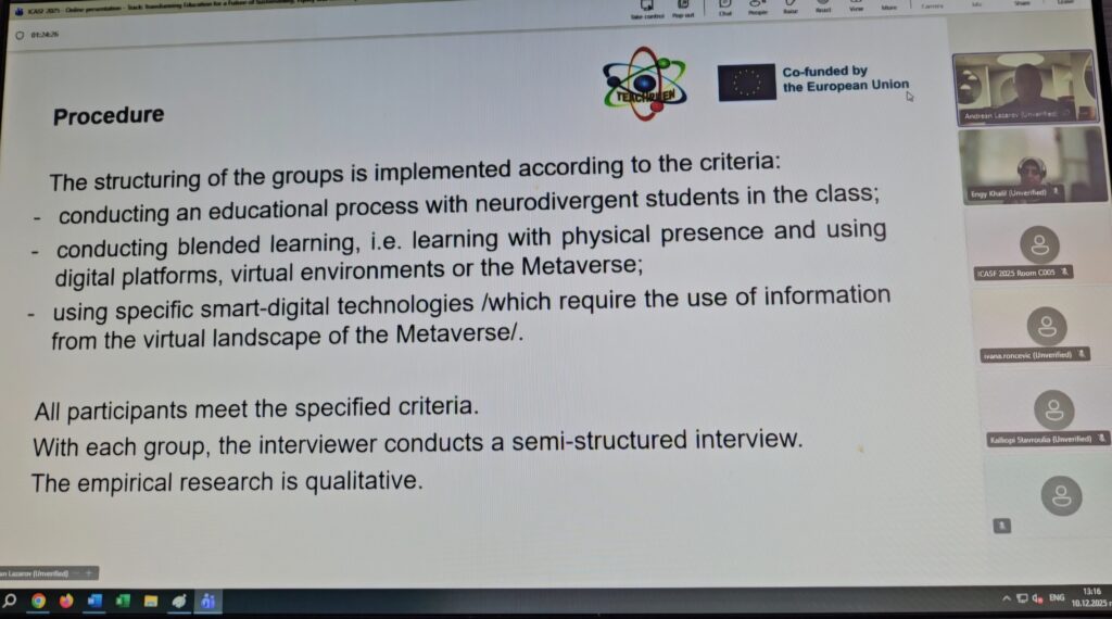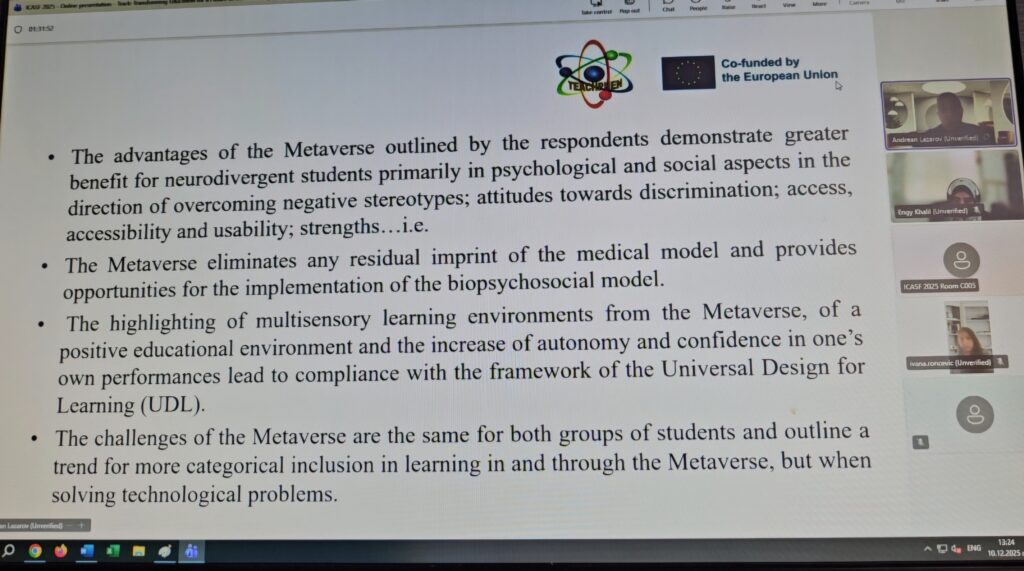 The event was held on 10th and 11th December 2025, in Abu Dhabi, UAE and allows also online presentation. Our representatives presented the full version of R1. Teachers’ supportive handbook on phenomenon based learning concept combining science, geography, mathematics, history as well as the framework of R2.Online supportive course including self-assessment mechanism on green competences acquisition with regards to climate change via phenomenon based learning for students with mild disabilities. In that way, we have extended our dissemination network beyond the European union.